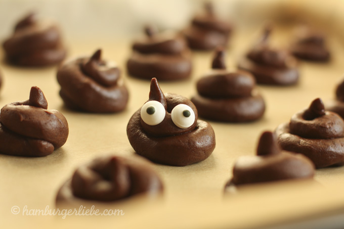 Weil ich meinen Kindern den Spaß – den sie zweifelsohne haben werden – nicht vermiesen möchte, habe ich in die uralte Trickkiste gegriffen und mal wieder Kackikekse gebacken. Die habe ich schon vor Jahren bei Frau Liebe entdeckt. Das Rezept habe ich nach meinen Vorstellungen abgeändert. Man kann eigentlich jeden Mürbeteig verwenden, muss nur darauf achten, dass man zusätzlich zum Kakao auch noch eine flüssige Zutat aufstockt, denn sonst werden sie arg trocken. Außerdem solltet ihr etwas mehr Backpulver verwenden, da ihr sonst Kuhfladen und keine kompakten Häfchen bekommt. Hatte ich auch schon auf dem Backblech liegen...